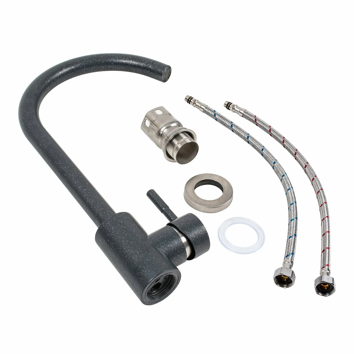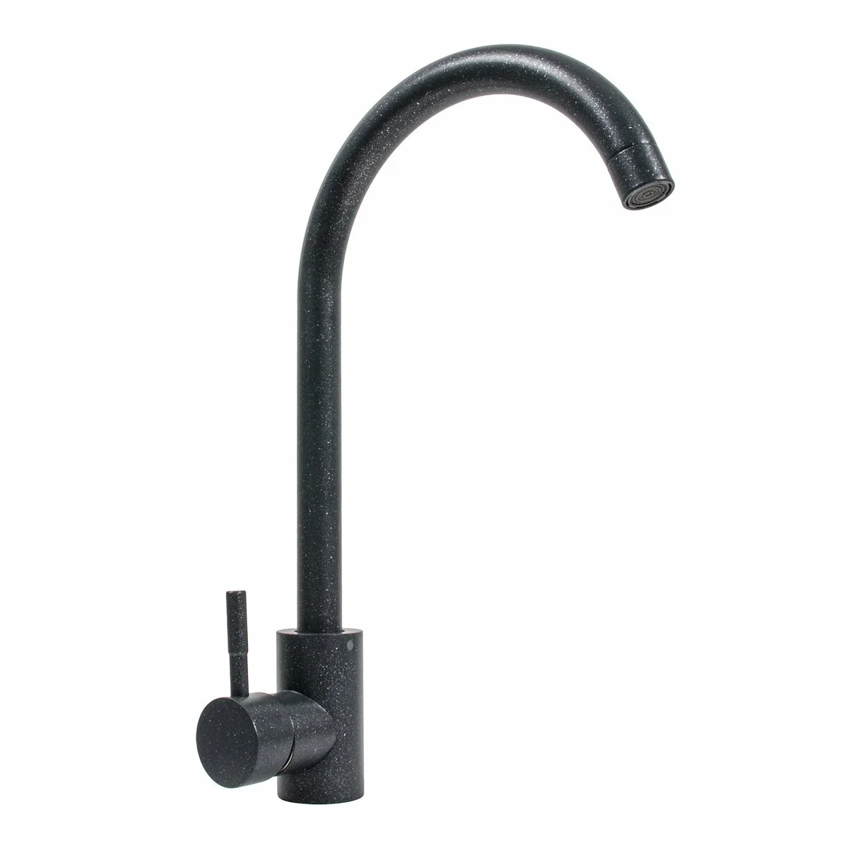 Змішувач кухонний Platinum 56 B NESP (3008 А)Антрацит відзначається сучасним та стильним дизайном. Він має колір Антрацит, який додає елегантності та оригінальності вашій кухні. Його висота складає 330 мм, що робить його ідеальним для використання з великими посудинами та каструлями. Довжина виливу становить 200 мм, що забезпечує зручність при наповненні горщиків та митті посуду. Змішувач виготовлений з високоякісної нержавіючої сталі SUS304, що гарантує його тривалий термін служби та стійкість до корозії.