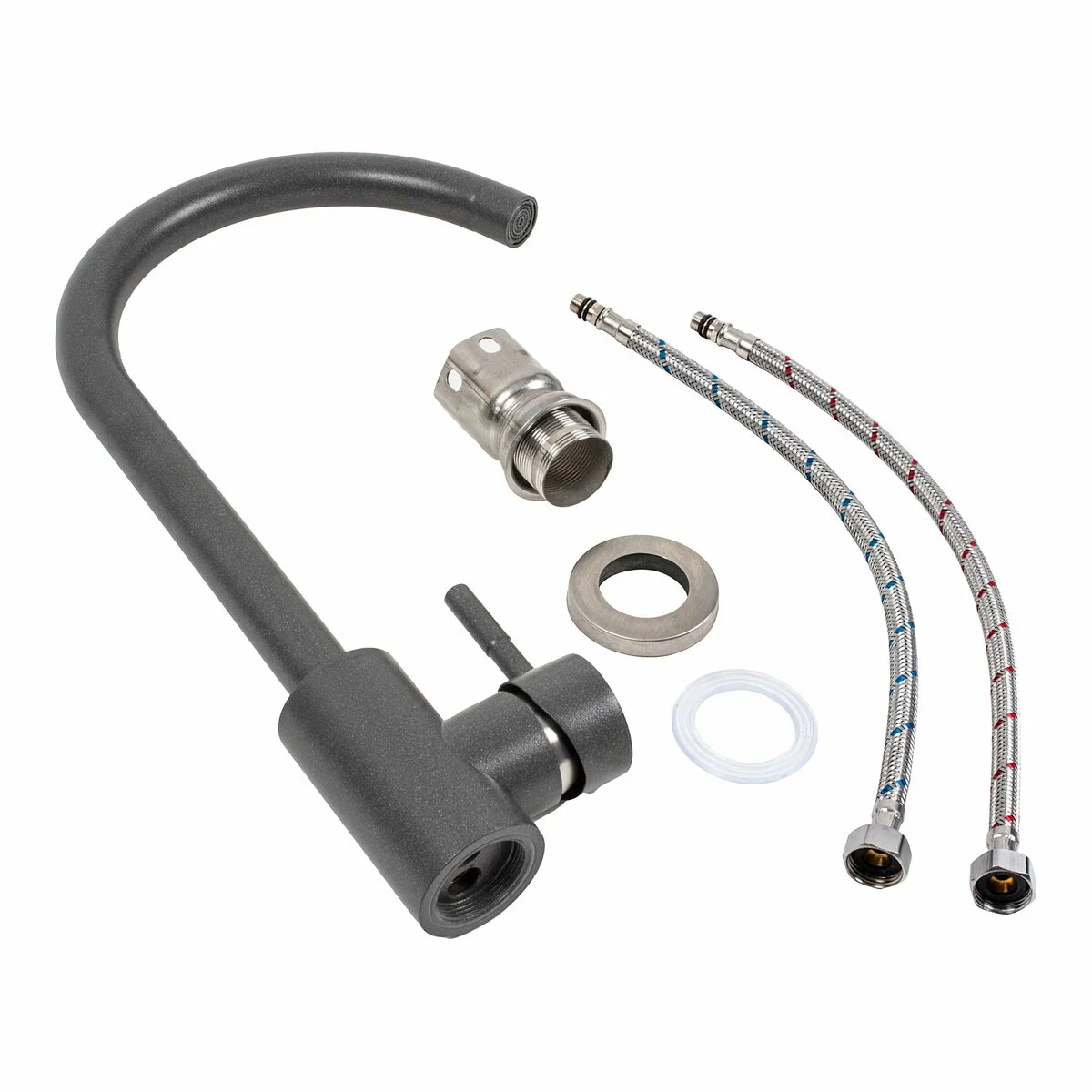 Змішувач кухонний Platinum 56 B NESP (3008 А)Моріон відзначається сучасним та стильним дизайном. Він має колір Моріон, який додає елегантності та оригінальності вашій кухні. Його висота складає 330 мм, що робить його ідеальним для використання з великими посудинами та каструлями. Довжина виливу становить 200 мм, що забезпечує зручність при наповненні горщиків та митті посуду. Змішувач виготовлений з високоякісної нержавіючої сталі SUS304, що гарантує його тривалий термін служби та стійкість до корозії.