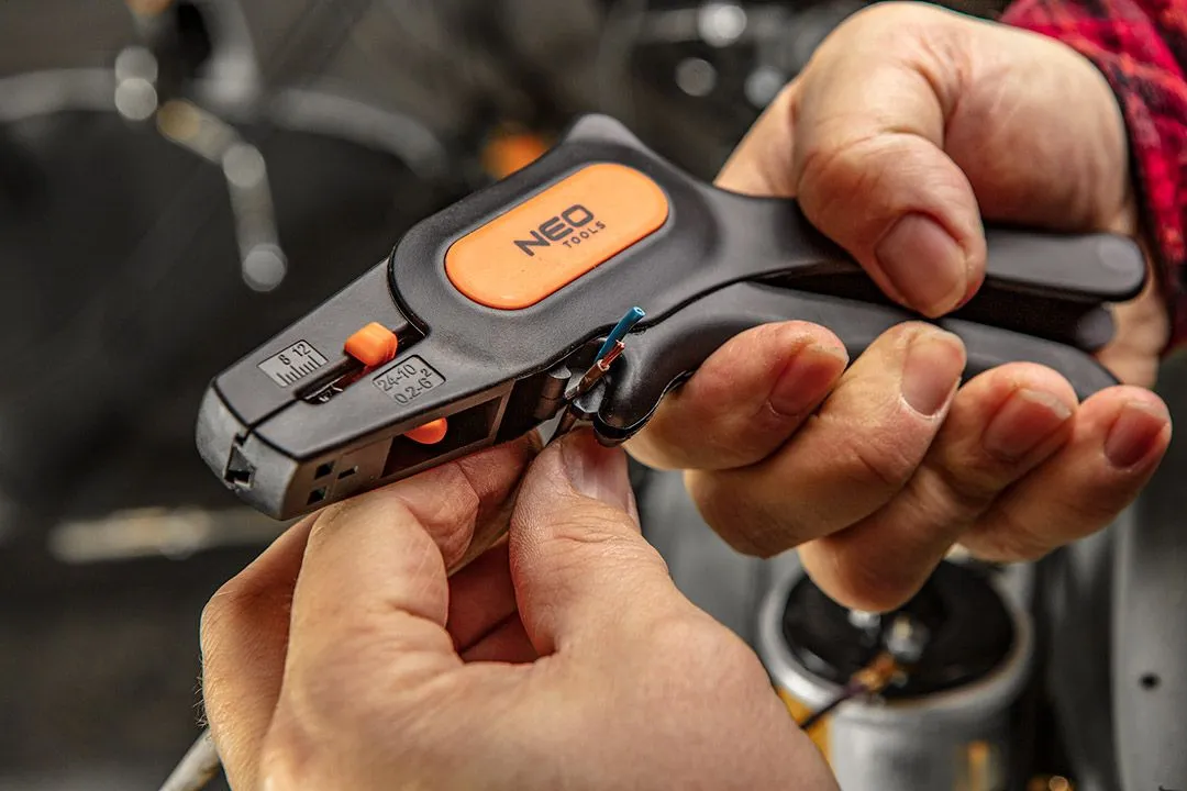 Автоматичний знімач ізоляції NEO для проводів, перетином від 0.5 мм² до 6 мм² (24-10 AWG). З регулюванням довжини на інструменті, знімається ізоляція від 5 до 12 мм. Міцний корпус розроблений зі скловолокна, армованого нейлоном та має блокування. Губки з високосортної легованої сталі SK5 гарантують міцність та гостроту знімача. У рукоятці вбудований різак, що призначений для різання кабелів з максимальним діаметром 2 мм².