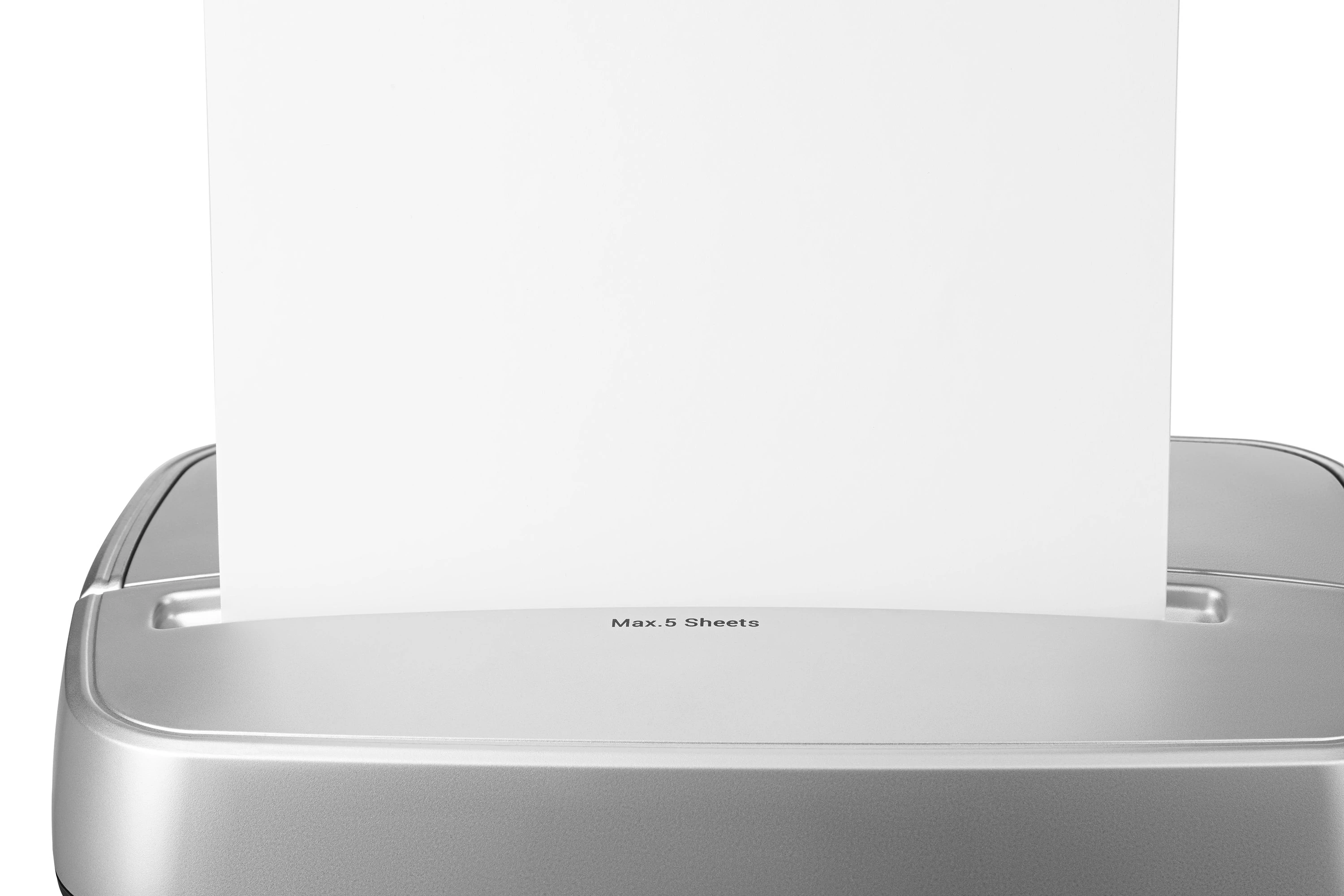 Знищувач документів та кредитних карток з ручкою для транспортування. Приймач розраховано на одночасне знищення до п’яти листків А4. Для зберігання відходів передбачено зручний контейнер на 12.5 л. Управління реалізовано за допомогою трьох режимів – Авто, Реверс, а також постійна робота. Тип різки – перехресний, а розмір знищеного паперу – 4×35 мм.